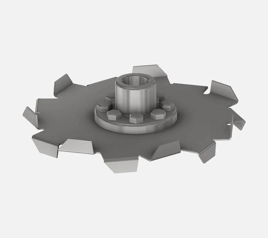 Mostly used for gas dispersion application. Curve blade (Concave, parabolic etc.) disc can handle 2 to 6 times more gas than flat blade disk turbine. Power drop between gassed and un-gassed condition is very less than conventional flat blade disk impellers. Hence it is preferred choice for gas dispersion applications viz. Fermentation, Hydrogenation, Oxidation, Carbonization, Ethylation etc.